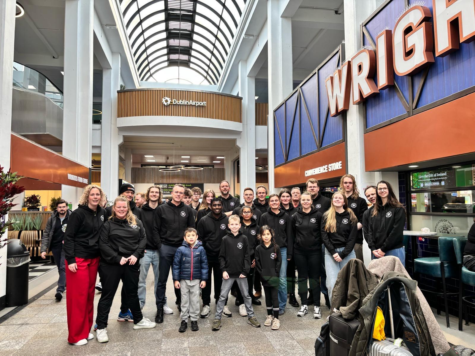 Op 20 februari 2026 vertrokken 27 Taekwondokas en belangstellenden om mee te doen aan het ‘Sword of Friendship’ evenement in Cork-Ierland. Via de trein-vliegtuig-bus werd gereisd naar Schiphol-Dublin Airport-Cork-stad in nog geen 11 uren. De groep deelnemers en belangstellenden hadden er zin in en de stemming was opperbest. Voor sommigen spannend omdat het hun eerste vliegreis was maar het viel allemaal mee, alhoewel sommigen moesten hollen om de gate te halen dankzij een trage security-check op Schiphol. Na aankomst in Cork, en het inchecken in hostell ‘Shamrock Inn’, werd er om 20.00 uur nog een warme maaltijd genuttigd in een lokaal restaurant.